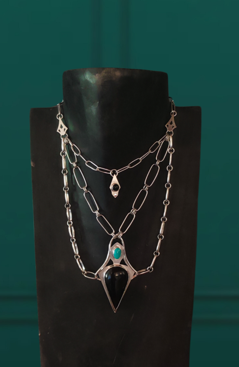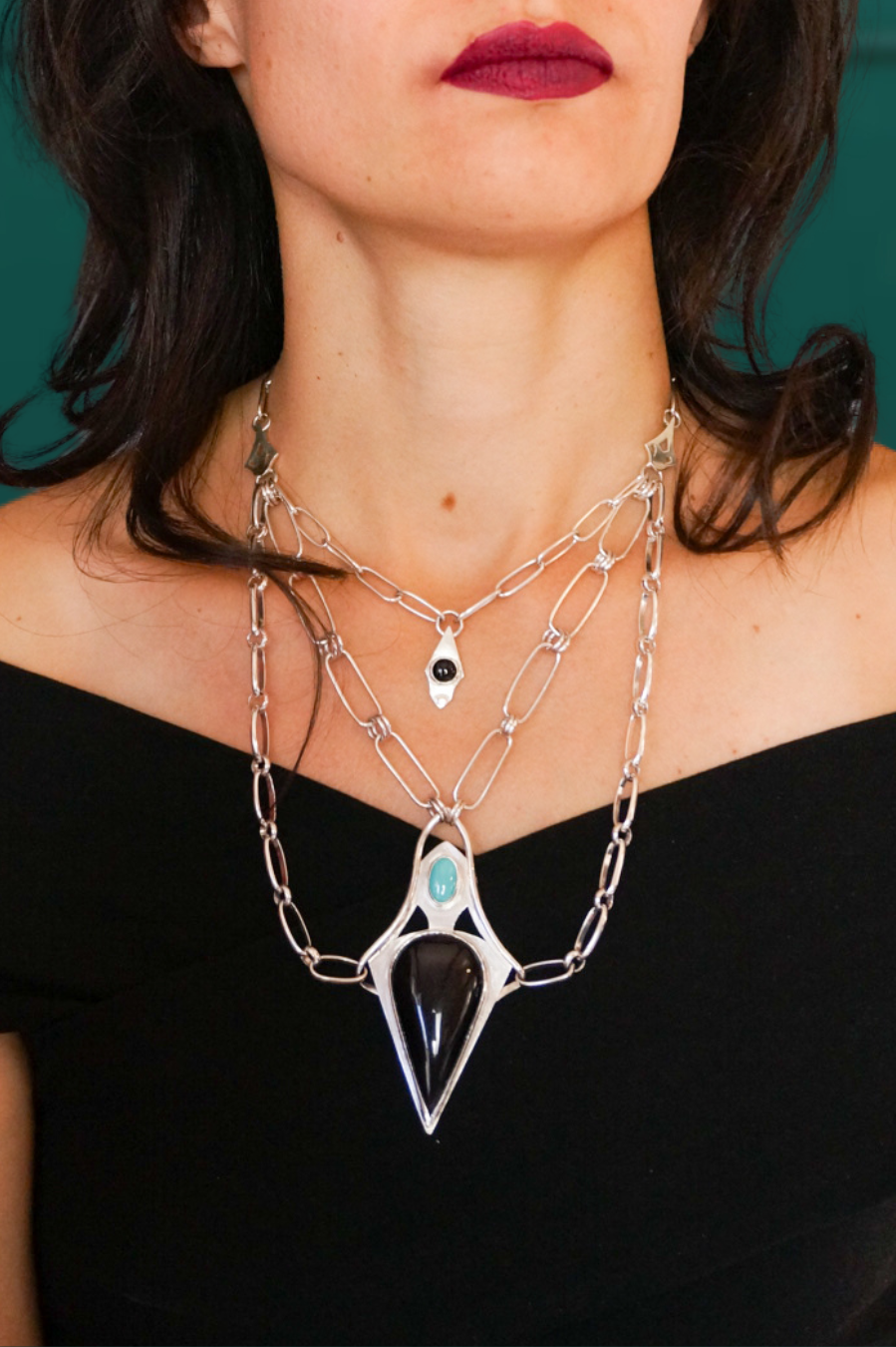 Orné de turquoise, obsidienne œil céleste et spinelle noir, et entièrement fait à la main (y compris la fabrication de tous les anneaux de chaînes), ce collier créera un look saisissant et unique pour quiconque ose le porter.