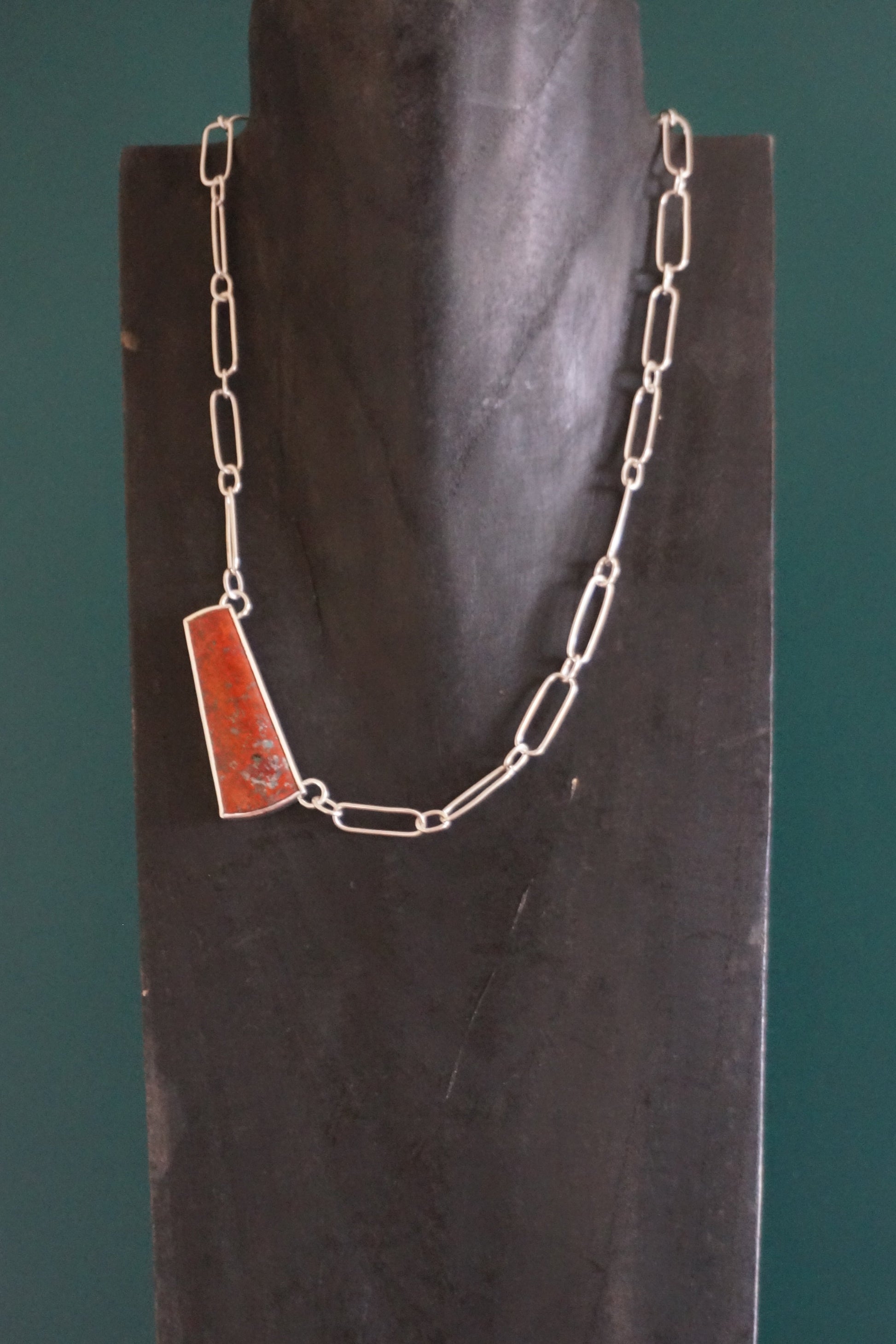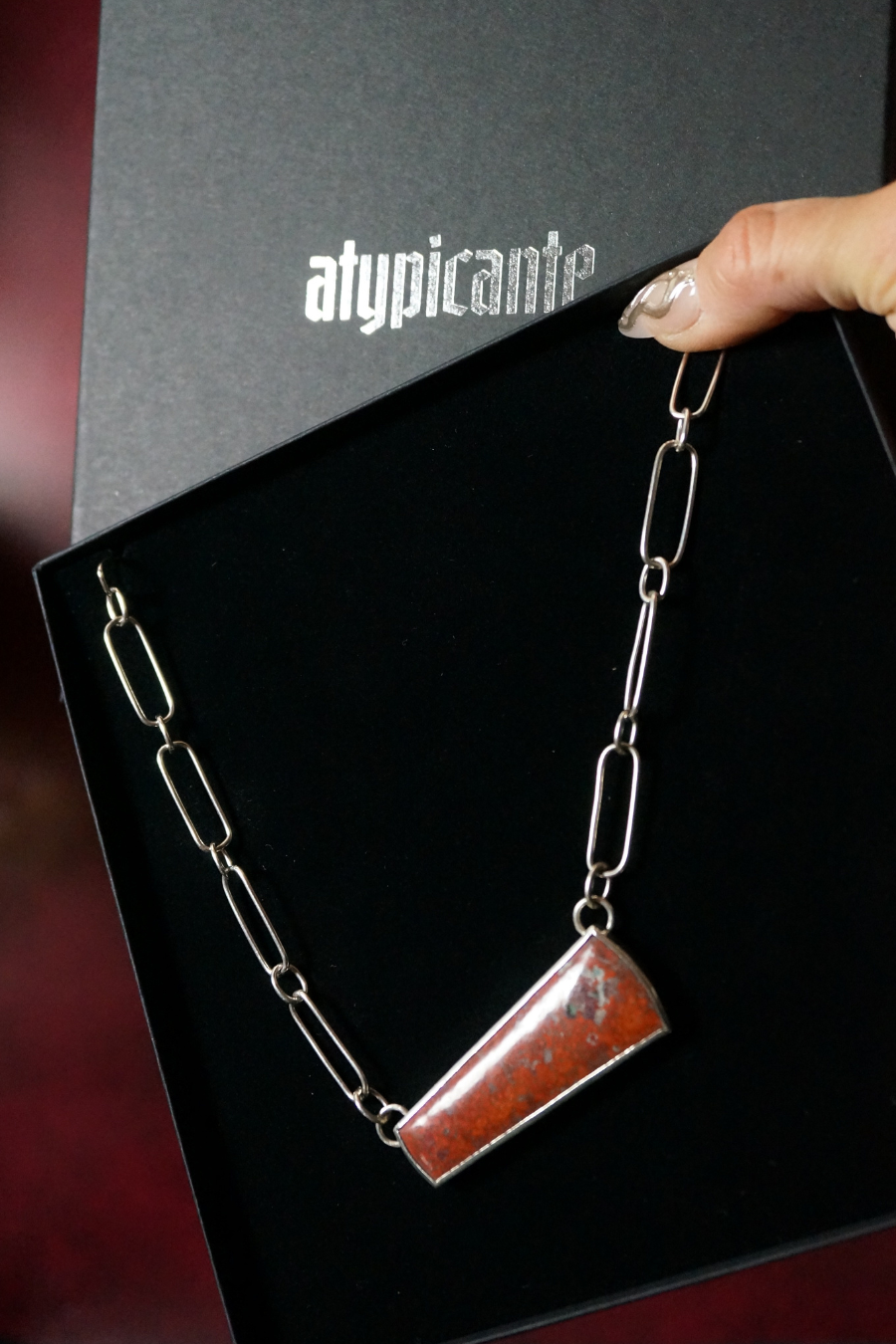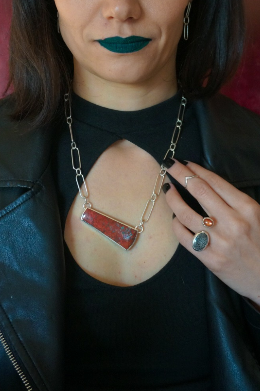 Sa chaîne large, sa forme unique et sa couleur en font un bijou audacieux qui attirera tous les regards.